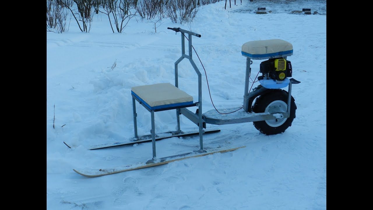 Сиденье чаще всего можно взять с того же скутера, а если хочется сделать своими руками, можно воспользоваться общедоступными схемами. Лыжи покупаются в магазине или находятся в гараже. Лучше всего использовать сверхлегкие горные лыжи, с ними мотосани в снег не провалятся. Некоторые самоделкины используют как основу популярные нынче модули для мотобуксировщиков. Но если ваша задача – мотосани с минимальными вложениями, то этот вариант не для вас.