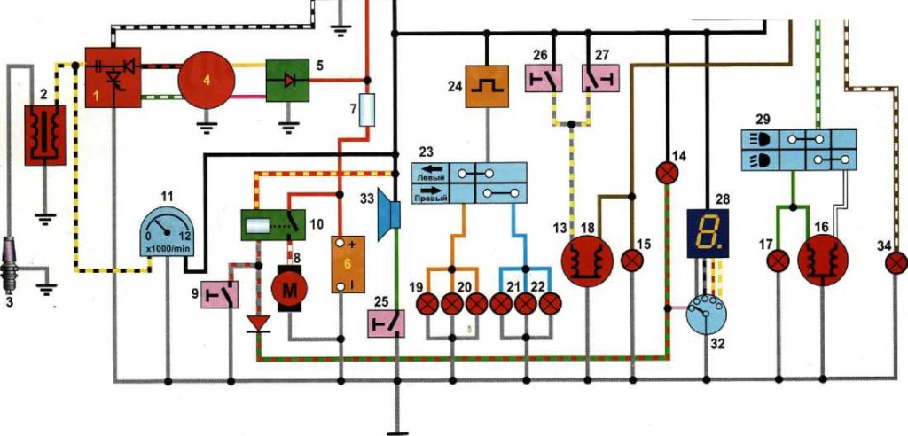 А у меня вот такой вопрос,я вообще не шарю в электрике,но вот на цветной схеме реле напряжения 4-ре провода,а у меня 5-ть черного нет,у меня 150 куб. китаец пионер адмирал,жопа какая-то с электрикой прозвонил все норм вроде а на жолтом проводе походу короткое замыкание,там такая кипа проводов что мне делать снимать всю проводку?