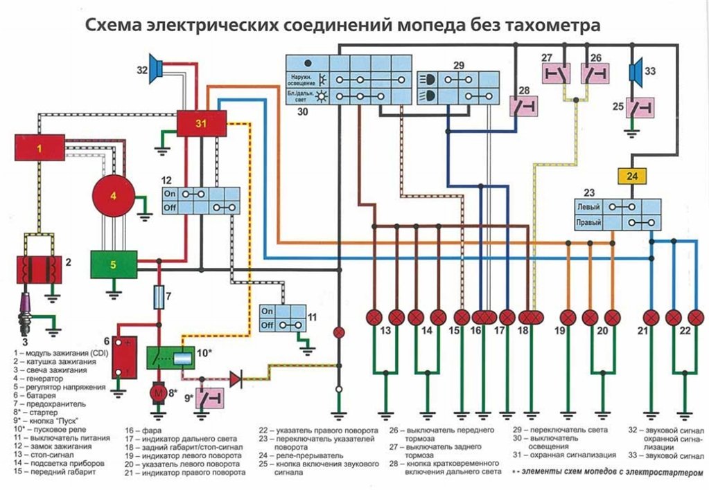 Видео в этой статье даст информацию относительно обслуживания схожих моделей. Для изделий с панелью приборов, содержащей тахометр, публикуем часть схемы, имеющей различия и в органах управления. В этом случае проводка на мопед Дельта дополнена несколькими элементами для подключения.