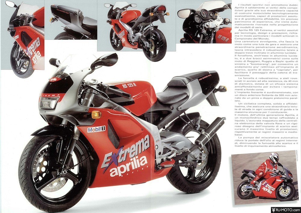 Первая модель мотоциклов Aprilia RS 125 носила название «Extrema» и указывалась с аббревиатурой «R». Он был оснащен двигателем Rotax 123 который мог развить мощность в 34 л.с., а так же регулируемой системой зажиганием, с передней телескопической гидравлической вилкой «MARZOCCHI» и задним регулируемым амортизатором «SACHS». Лишь первая модель Aprilia RS 125 была оснащена тормозной системой легендарной фирмы «Brembo» золотой коллекции.
