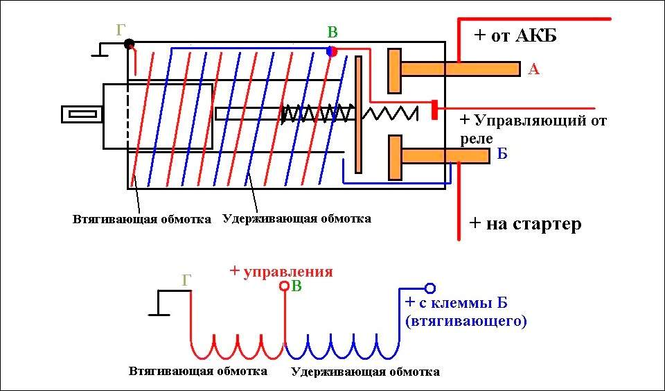 Когда вы поворачиваете ключ зажигания, электричество от замка подается на управляющий контакт. Появляется напряжение на первой обмотке (втягивающей). Электромагнитное поле этой обмотки притягивает шток, который своей пластиной замыкает два силовых контакта. Через контакты ток поступает на электродвигатель стартера. Так как выходной конец втягивающей обмотки соединен с одним из силовых контактов, то на нем появляется «плюс», исчезает разность потенциалов и пропадает напряжение на ней, соответственно и магнитное поле.