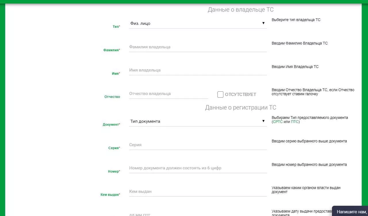 Введите все данные владельца, автомобиля, электронную почту и регион регистрации.