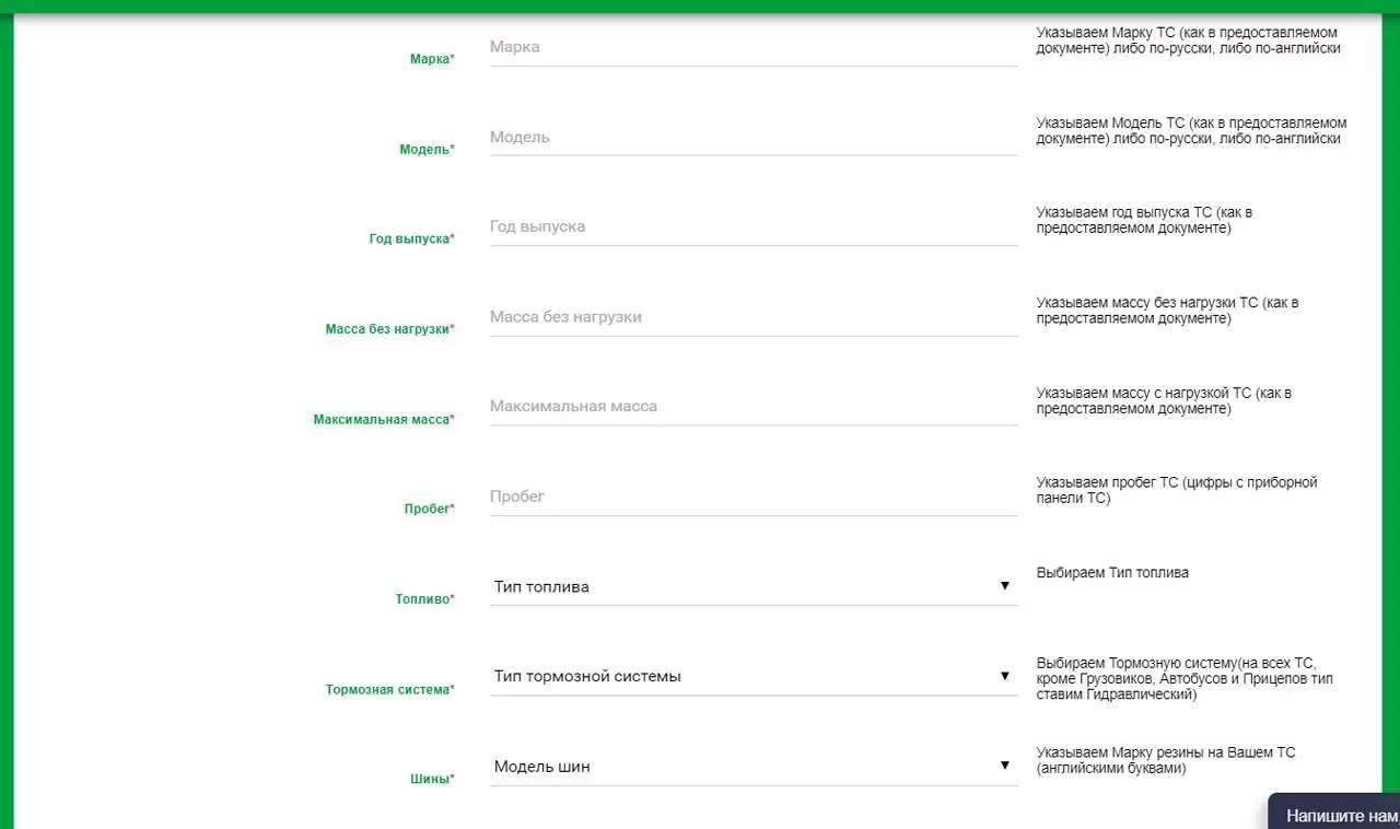 - Заполняете электронную форму, в которой указываете данные своего ТС: марку, модель, год производства, ряд других сведений о технических параметрах.