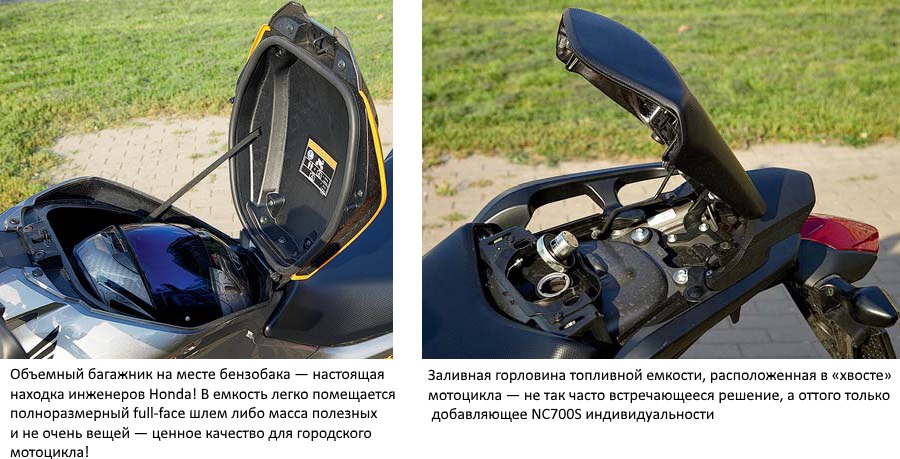 Особенно для работников АЗС, которые при каждой заправке мотоцикла подходят к фальш-баку и смиренно ждут, когда же владелец NC700S откроет топливную емкость. Настоящий же бензобак у нейкеда Honda расположен в «хвосте» и даже преимущественно в центре аппарата, а заливная горловина прикрыта пассажирским сиденьем.