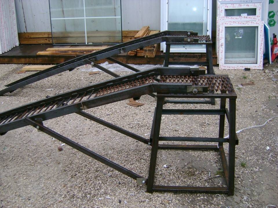 Также не составит труда изготовить трапы из черного металла. Подойдут трубы как квадратного, так и круглого сечения или обычный профиль. Берем две трубы необходимой длины, через 30-40 см. навариваем поперечные планки и делаем загиб для упора о борт прицепа. Далее получившиеся трапы можно зашкурить, покрыть грунтовкой и покрасить для придания более респектабельного вида.