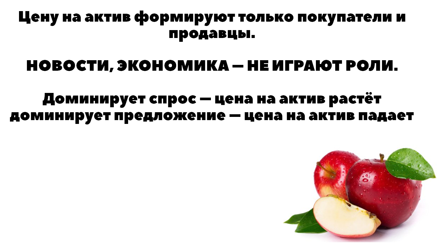 Цену создают и формируют только покупатели и продавцы. Новости, экономика, экономические показатели не играет никакой роли. Приведу вам наглядный пример с падением рубля. Недавно рубль у нас опять начал падать. Это вызвало панику у инвесторов. Все бегают, рвут на голове волосы, а если их там не осталось, то на пятой точке, и не знают что им делать.