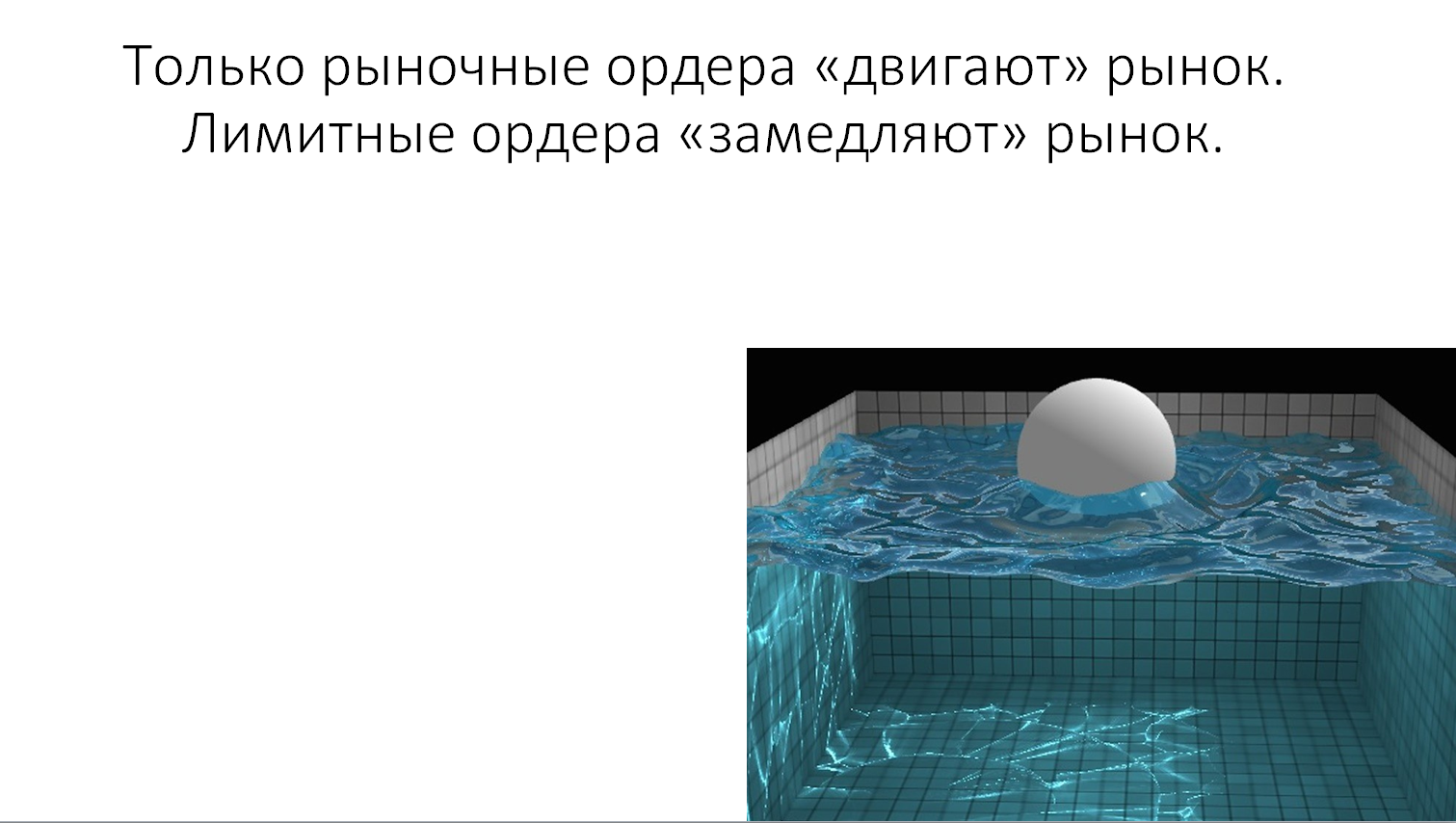 Здесь нужно отдать должное моему учителю, который в своё время преподал мне урок на примере шара в жидкости. Рыночные ордера двигают рынок, лимитные же его замедляют. На примере шара это можно объяснить так. Мы кидаем шар с определённой силой в направлении воды. Он ударяется об водную поверхность. Таким образом, мой бросок шара – это рыночный ордер, который цену двигает. Цена же после моего броска попадает в воду, тем самым, ударяясь об лимитные ордера. Из-за этого рынок потихоньку замедляется.