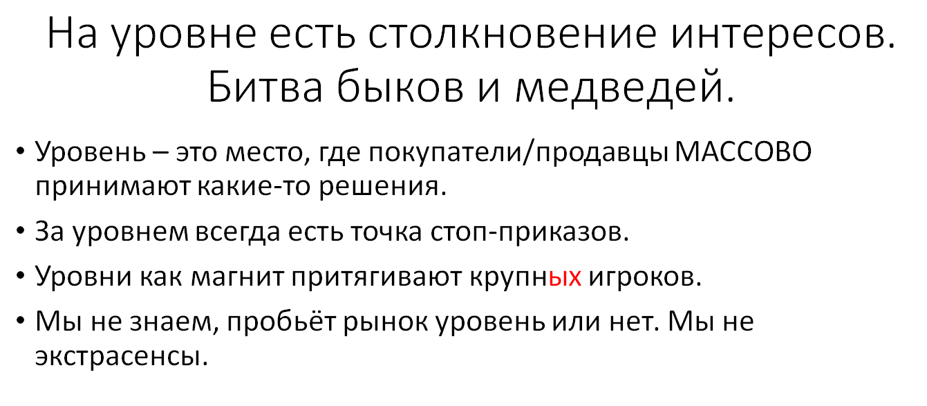То, что все выставляют уровни – это хорошо, потому что именно там мы можем следить за битвами быков и медведей. Продавец всегда хочет продать подороже, покупатель купить подешевле. Уровень – это как раз то место, где продавцы и покупатели МАССОВО принимают решения. Если наш дядя Вася захочет купить, то он никак на рынок не повлияет, а вот если у него появится тысяча единомышленников, то рынок на это сильно отреагирует.