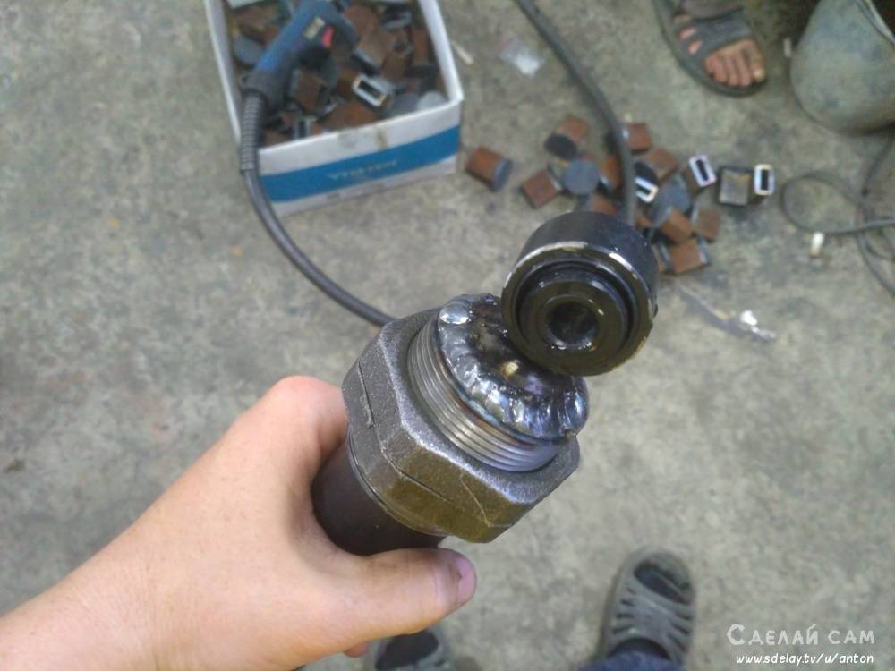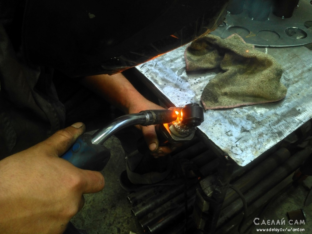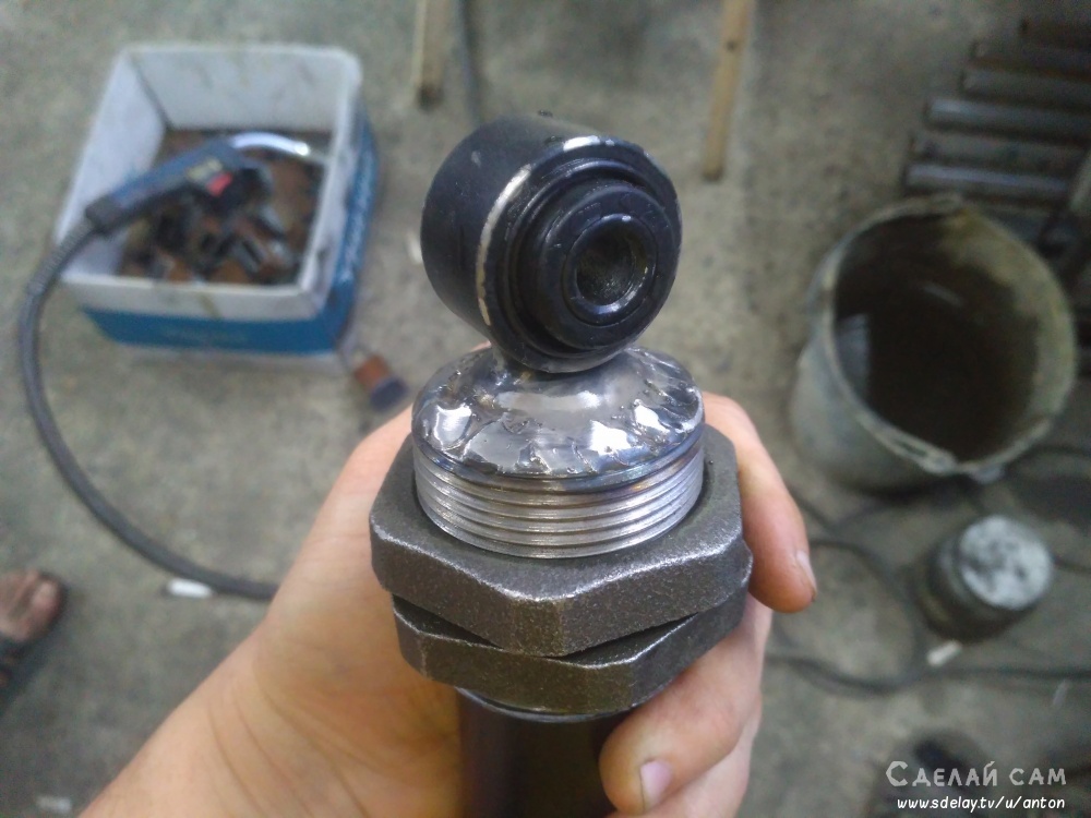 Привариваем резьбу к амортизатору. Делаем это аккуратно, периодически охлаждая амортизатор, т.к. он масляный и возможно закипание масла от перегрева. Сделали прихватку — охладили водой. И так далее.