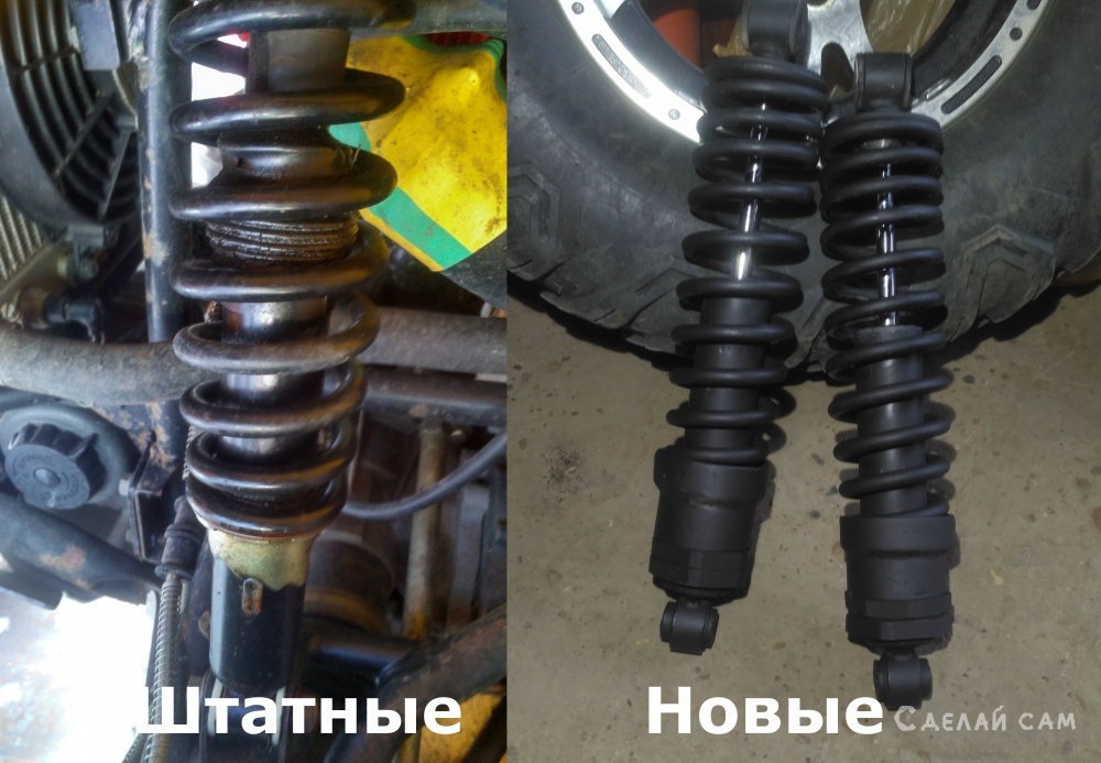 Очередная самоделка а тему квадроциклов. Статья в принципе будет полезна всем владельцам квадриков не сегодня, так в будущем точно. Речь пойдет, как вы поняли, о амортизаторах, а именно о замене штатных на ВАЗовские от ВАЗ 2101. В декабре я стал счастливым обладателем квадрика, б/у но в хорошем состоянии. У меня потек передний амортизатор, покопавшись в интернете и промониторив цены, я понял что я не хочу покупать штатные квадроциклетные ))). Цена в России на них от 5500 — 7500 тыс рублей и до 80 тыс руб за комплект. В интернете многие умельцы ставят амортизаторы от ВАЗ 2101 и пружины от ОКИ.