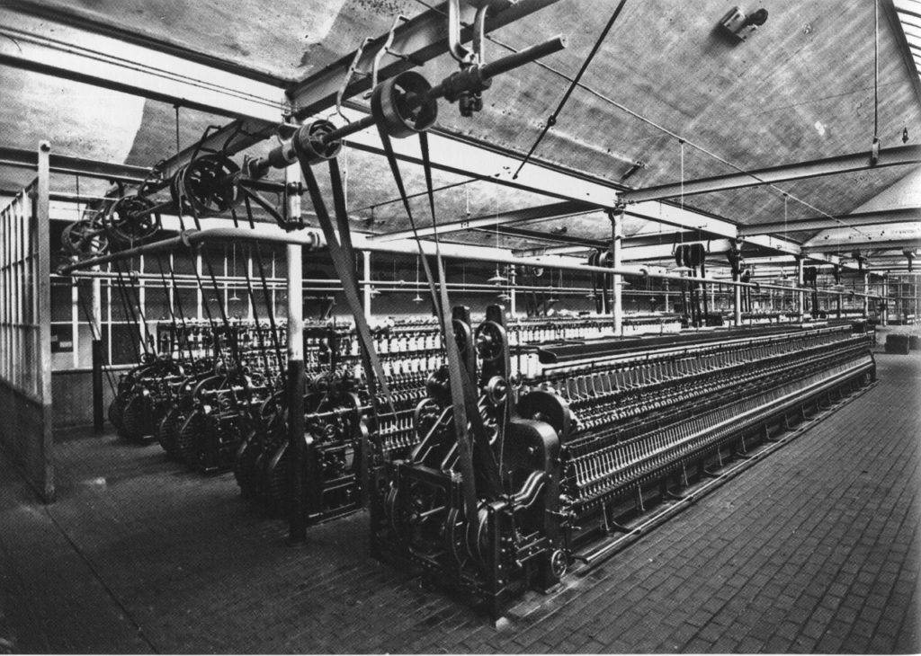 Рис. 13. Четыре прядильные машины приводятся в движение от плоских приводных ремней с линейного вала. Лейпциг , Германия, около 1925 года