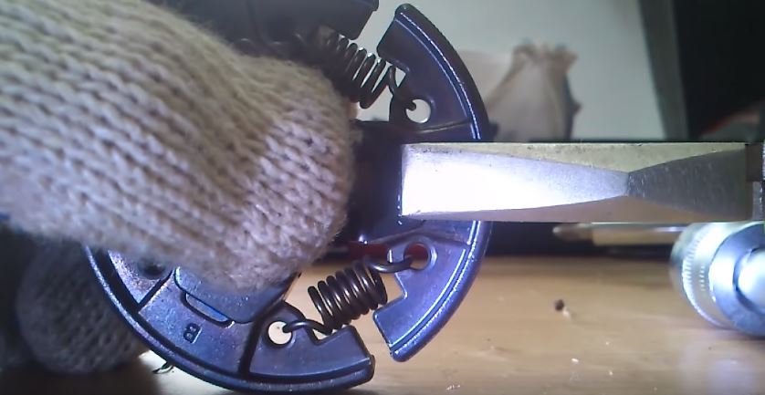 Теперь о принципе действия муфты бензопилы. Когда заводится двухтактный двигатель инструмента, начинает вращаться коленчатый вал. К валу крепится муфта, с которой при помощи звездочки соединяется цепь. Когда бензопила работает на холостом ходу (скорость вращения вала до 2700 оборотов в минуту), то есть не нажимается курок акселератора, то пружина прижимает фрикционные накладки, в результате чего крутящий момент не передается на барабан.