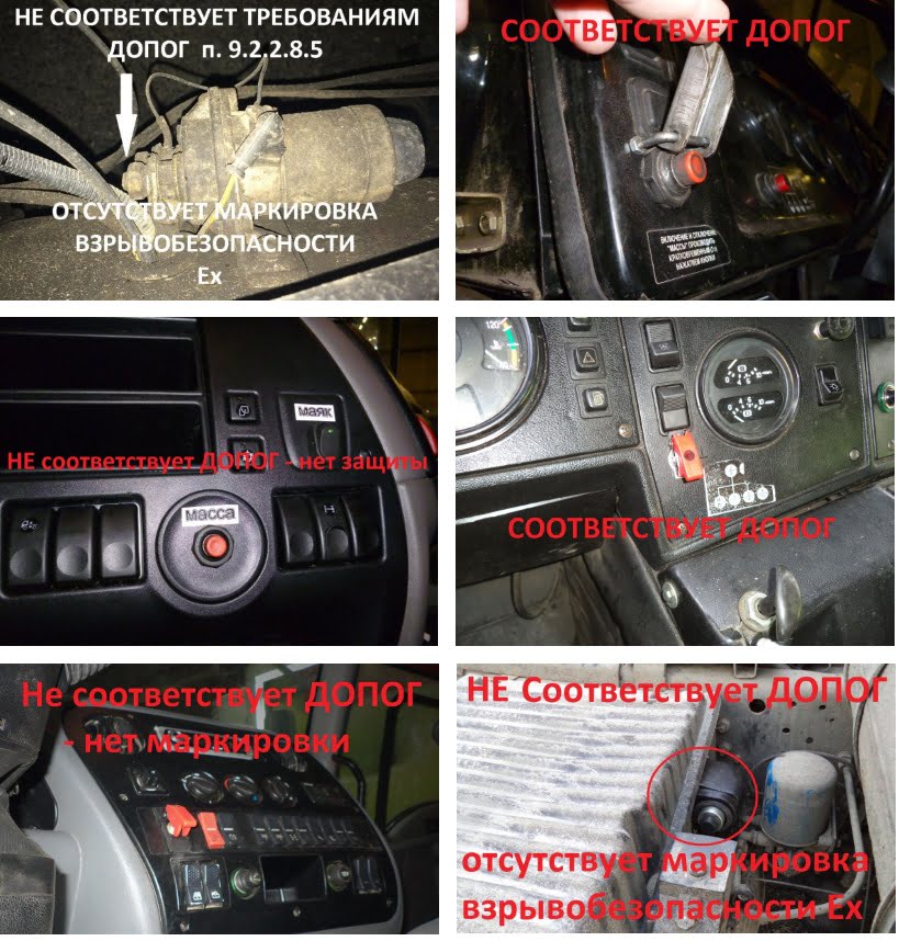 В связи с тем, что главный выключатель аккумуляторной батареи постоянно находится под напряжением, то на него в полной мере распространяются требования п. 9.2.2.9 ДОПОГ. Поэтому главный выключатель аккумуляторной батареи должен иметь характеристики, позволяющие использовать его в опасных зонах и отвечать требованиям МЭК 60079 (п. 9.2.2.9.1 а)). В частности п. 29.1 МЭК 60079 требует наличия на главном выключателе аккумуляторной батареи соответствующей маркировки, которая должна быть видима даже после монтажа выключателя на автомобиль. Требования к информации, содержащейся в маркировке приведены в пунктах 29.2 -29.4 МЭК 60079. Отсутствие маркировки на главном выключателе аккумуляторной батарее является подтверждением не соответствия главного выключателя АКБ требованиям ДОПОГ (в частности п