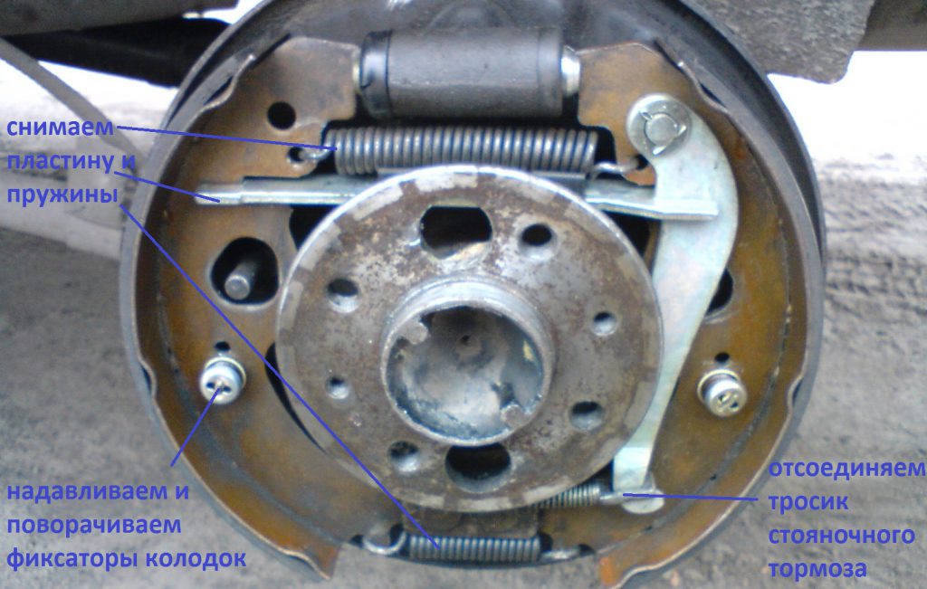- снимаем тормозной барабан (если барабан не поддается — аккуратно постукиваем молотком, на некоторых моделях в барабане имеются специальные отверстия, куда вкручиваются 2 болта и, тем самым, выталкивают тормозной барабан)